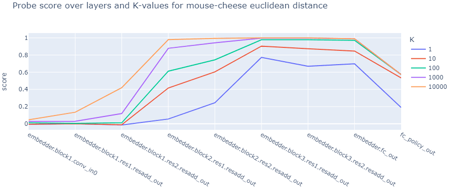 The previous experiment suggested that a set of layers are strongly affected by the distance between the mouse and the cheese across the map. It was also hypothesized that the first layer demonstrating this kind of correlation (embedder.block3.res1.resadd_out) could correspond to being the layer that encodes mouse-cheese distance as an input feature for the cheese-seeking behavior. To analyze this hypothesis, we extended our probing experiments to explicitly target the euclidean mouse-cheese distance.