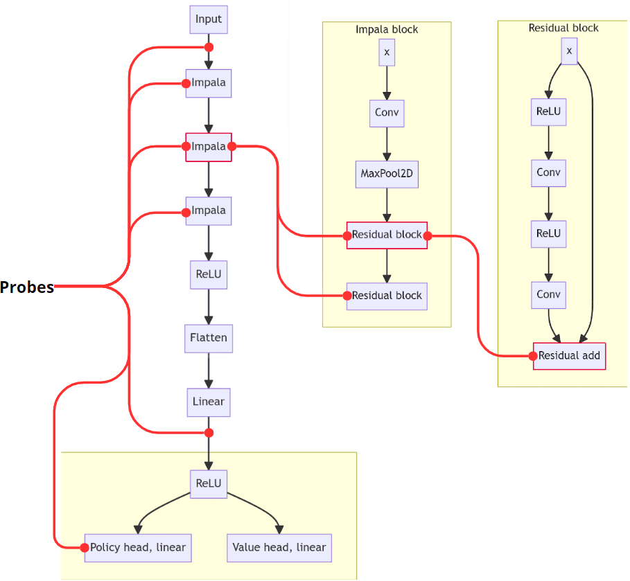 Policy network structure. In red are most of the points of the network that are being probed. Connections to the impala blocks and residual blocks, while displayed for only one of the layers, occurs for every instance of the impala and residual blocks in the layer. Original image from “Understanding and controlling a maze-solving policy network”
