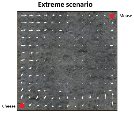 We first examined an extreme scenario where the mouse and cheese were maximally distant. The results indicated: