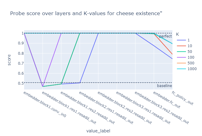 To gain insights into the granularity of cheese representation, we implemented a top-k activation approach. This method restricts the probe's access to only the top-k neurons most correlated to the target variable (in this case cheese presence) for each layer, with k varying between 1, 10, 50, 100, 500, and 1000. This approach allows us to assess how much "context" is required to accurately detect the presence of cheese at each layer. For instance, k=1 means the probe can only access a single activation per layer to make its prediction.