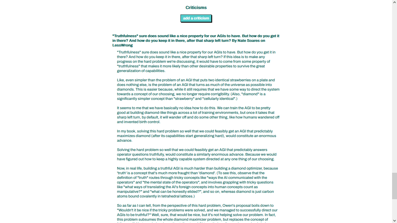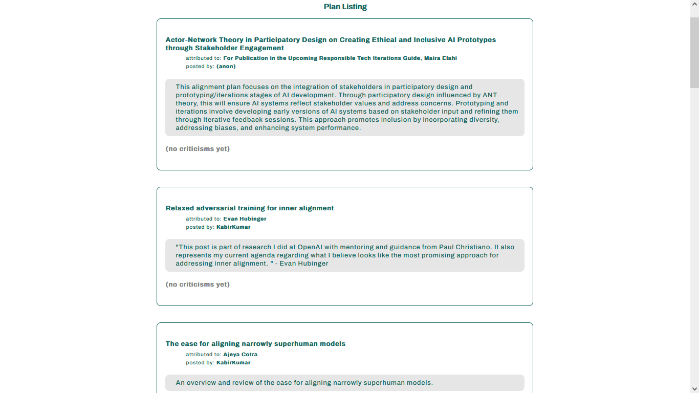 Also beware building around an ontology that might not be quite right. "Plan" and "criticism" I don't think will capture much of the discussion that needs to be had. Many people's work will be more narrowly scoped than being a plan, more like an investigation into some topic that seems like it might be useful as part of a larger plan (e.g. exploring a concept or particular interpretability approach), and a criticism might be more like "you assume X, but it's not clear X is true", in which case the response should be an exploration of whether or not X is true, not trying to revise the plan to avoid the assumption. A good exercise might be trying to fit the MIRI Dialogs into your format and seeing how well that'd work.