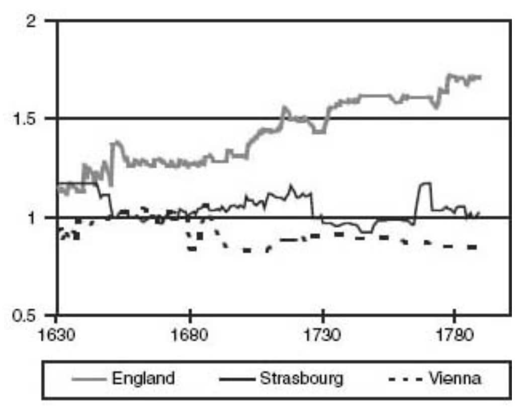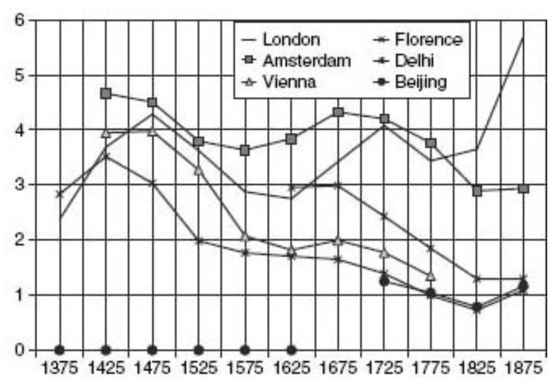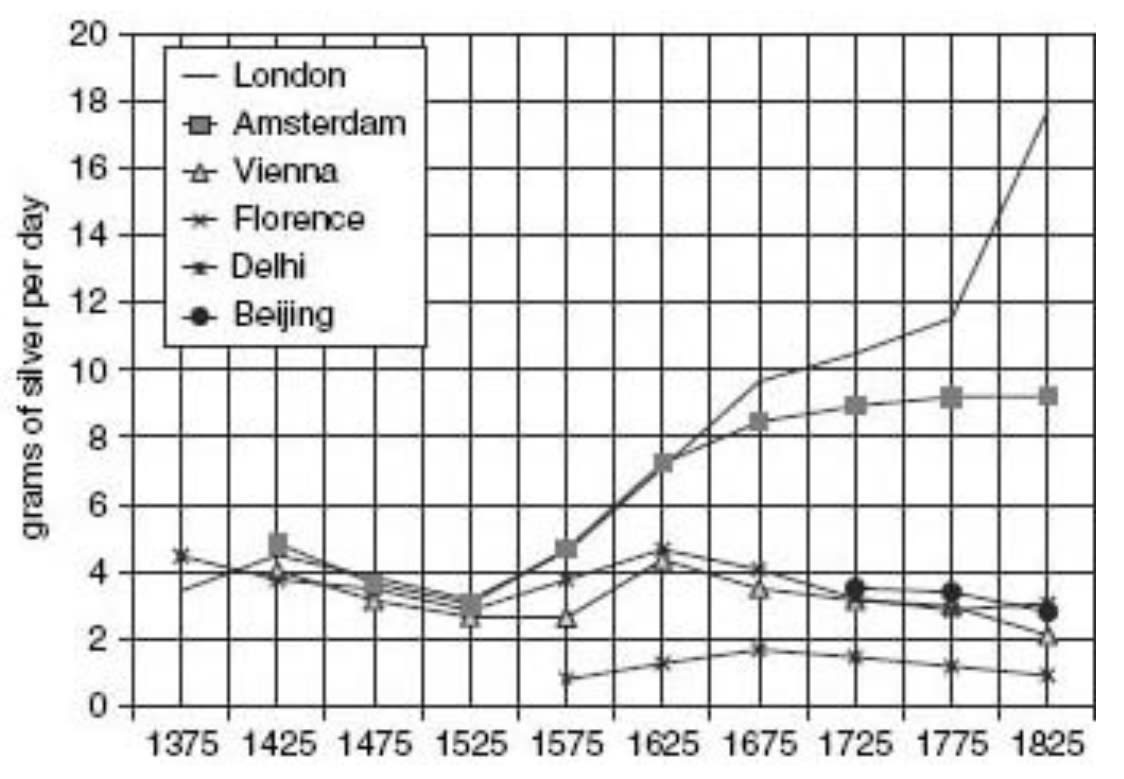 Here are workers’ wages in various cities around the world. By the 18th century, wages in London and Amsterdam were more than twice that of other major cities: