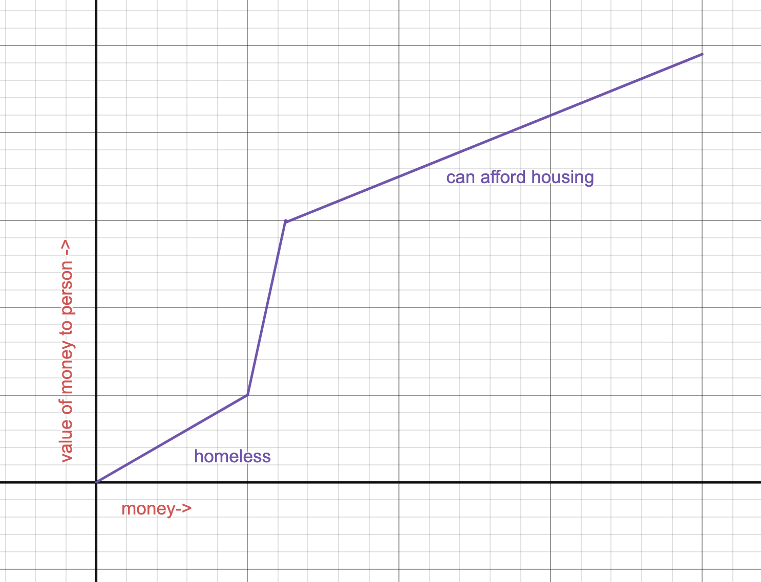 In real life the function will also be less simple; there will be many places where the rate of value increase per money increase changes, rather than just one that occurs when the person can afford housing.