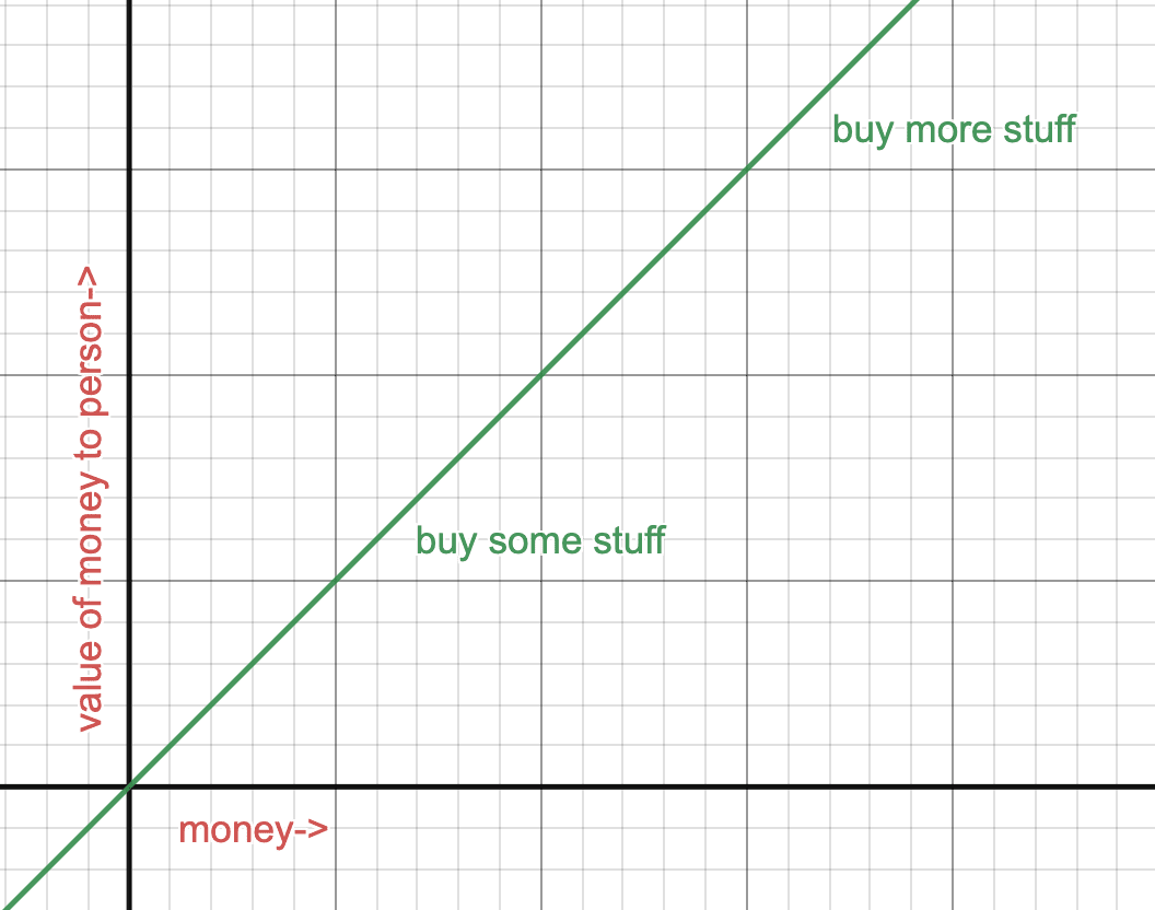 For example, when saving up to buy something, each increase in money affects the ability to buy it the same amount. This makes the graph of money value linear during the range where extra money will be put towards saving for that thing.