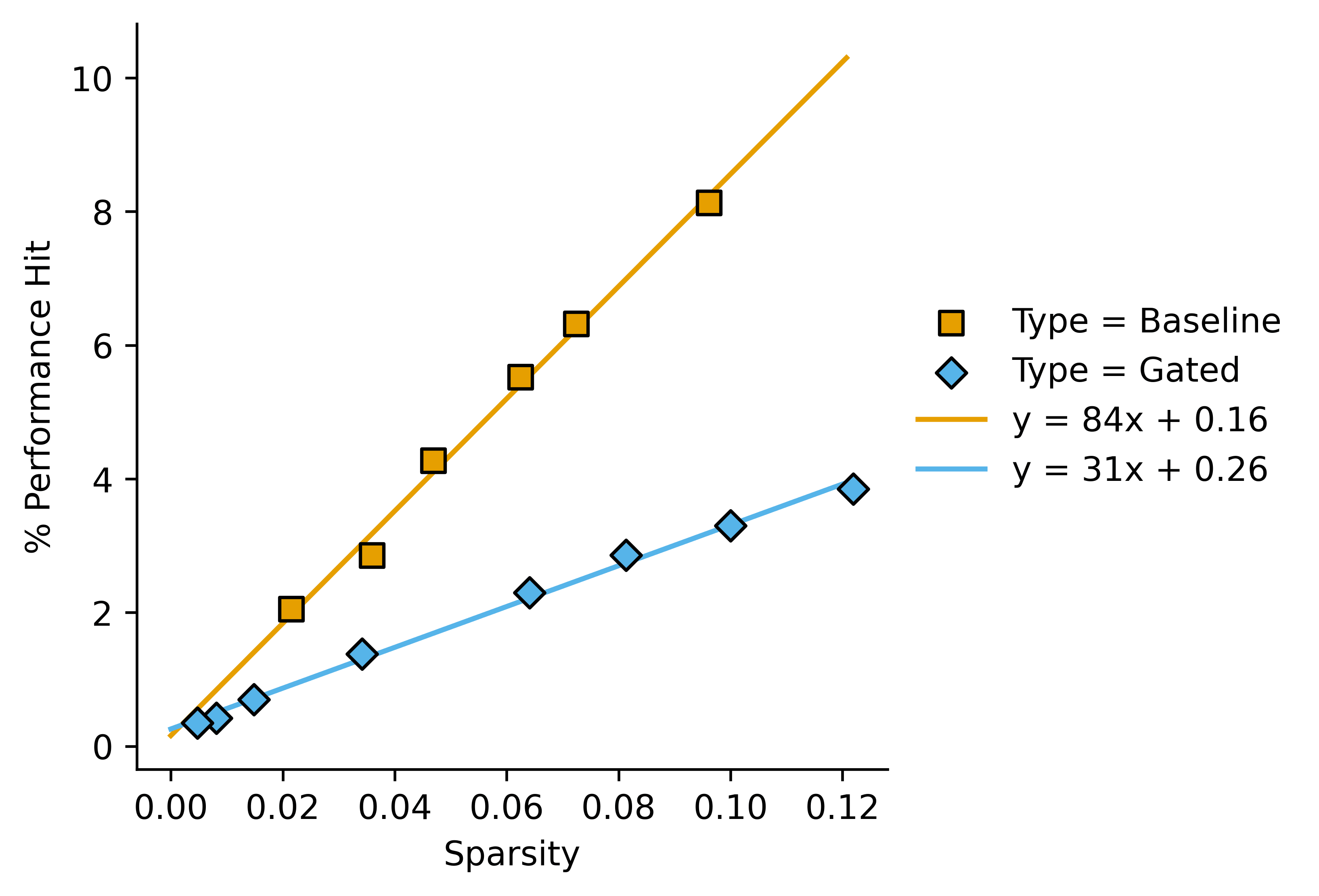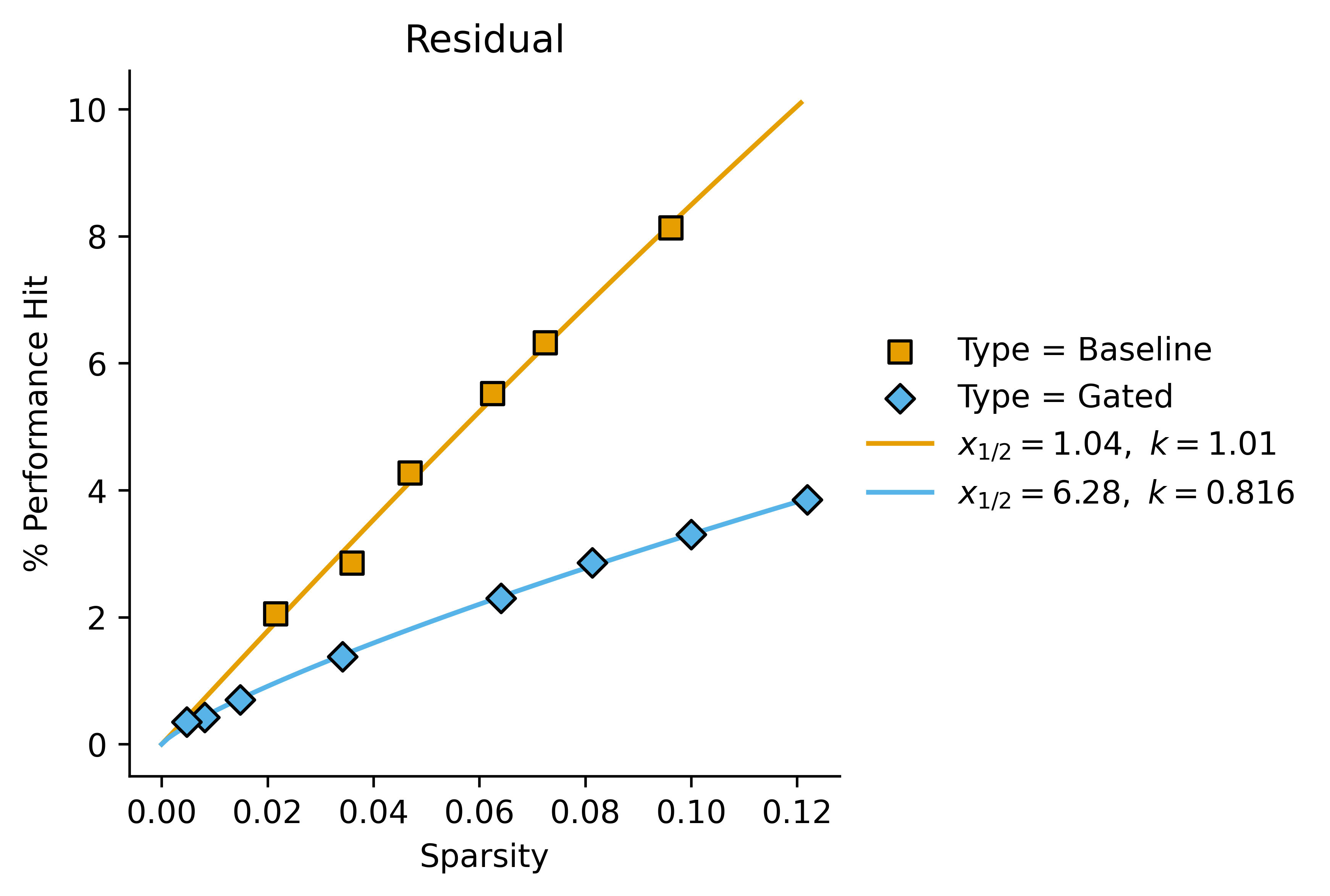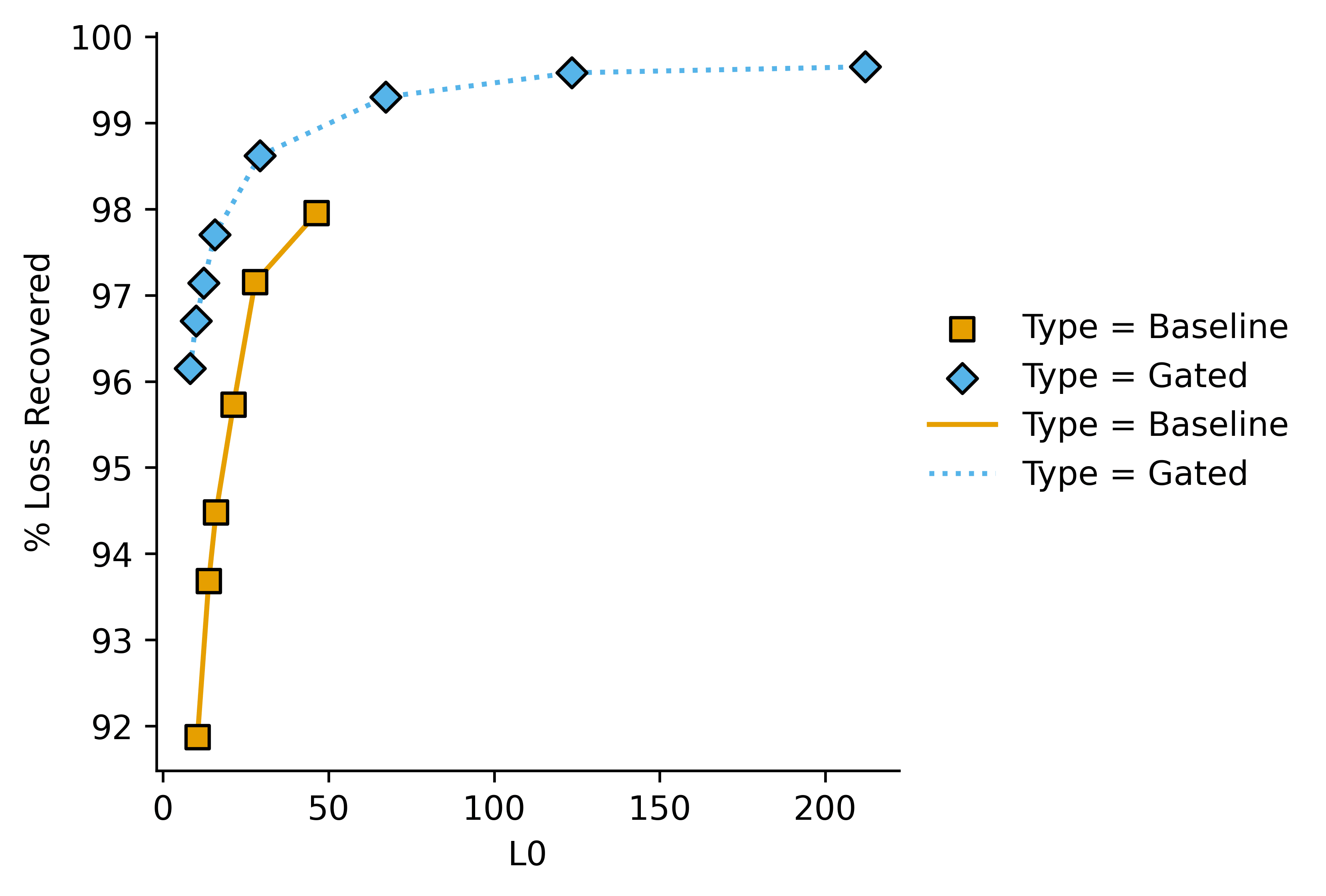 This lets us say something like "In this case, gated SAEs outperform baseline SAEs by a factor of around 2.7 as measured by Performance Hit/Sparsity".