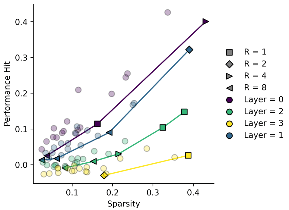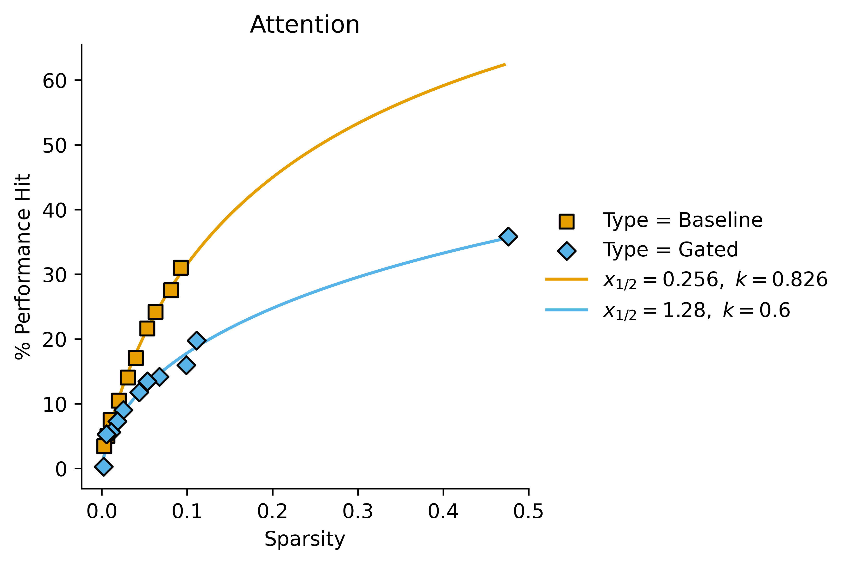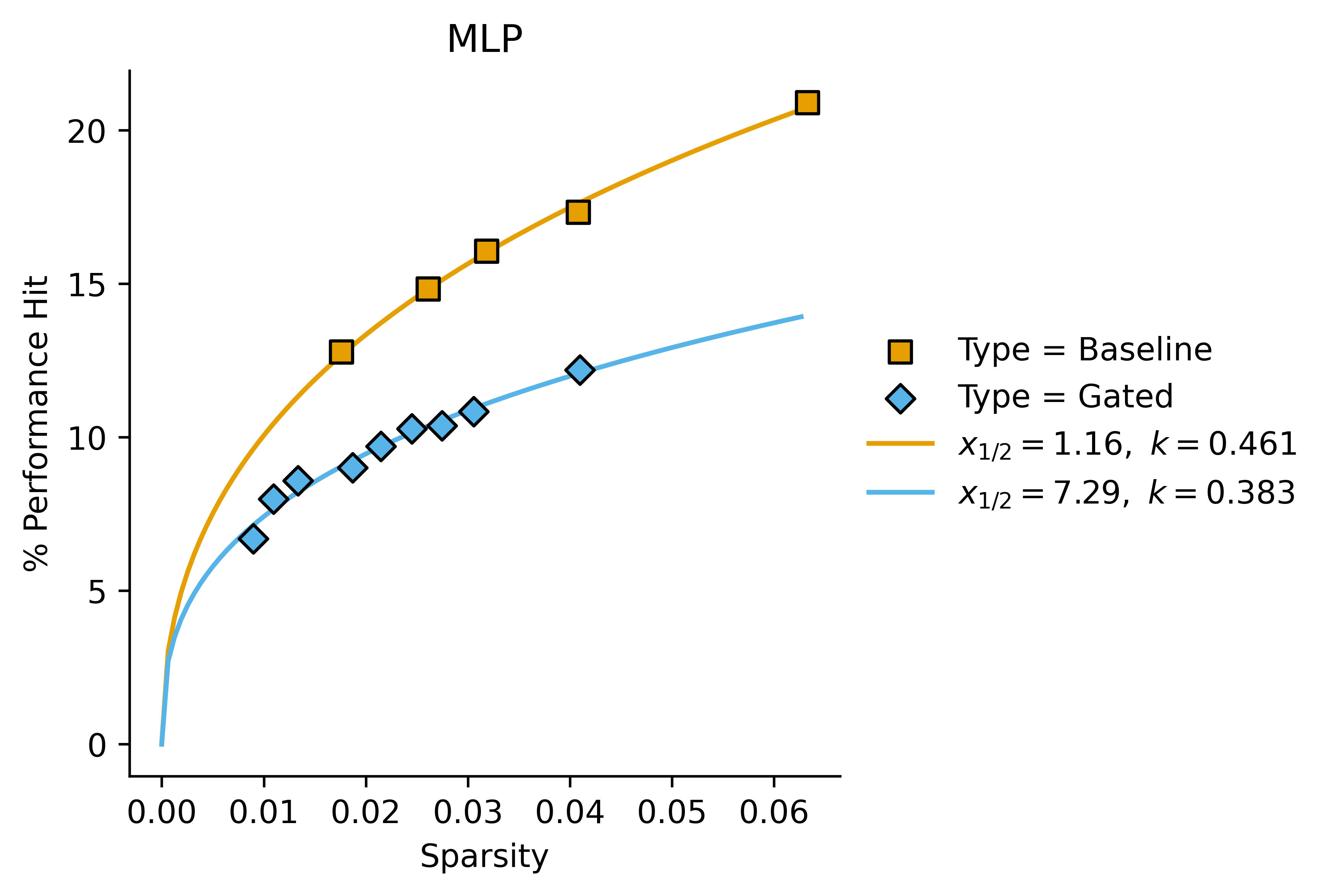 This lets us say something like "In this case, gated SAEs outperform baseline SAEs by a factor of around 2.7 as measured by Performance Hit/Sparsity".