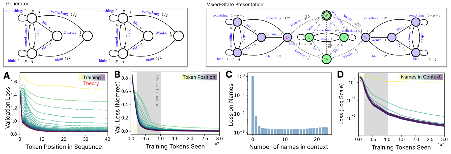 Another interesting aspect of this story is that it conceptually connects to induction heads. Induction heads can be thought of as a natural solution to the source disambiguation that is a necessary part of belief updating over nonergodic data. We ran experiments where we trained transformers and RNNs over simple toy non-ergodic training data and found preliminary evidence for induction head formation, like phase transitions in the loss over training, similar to Anthropic’s findings on induction head formation. Interestingly, evidence for a phase transition occurred in both transformers and RNNs. Of course, RNNs can’t literally be creating induction heads, since they have no attention mechanism. Which begs the question, what are they doing exactly? This at least gives a hint that induction heads are actually a specific instance of a more general class of source disambiguation or generalization mechanisms.