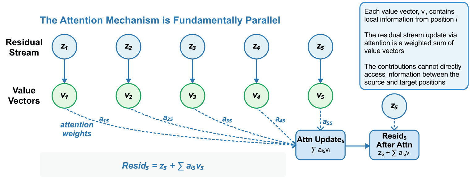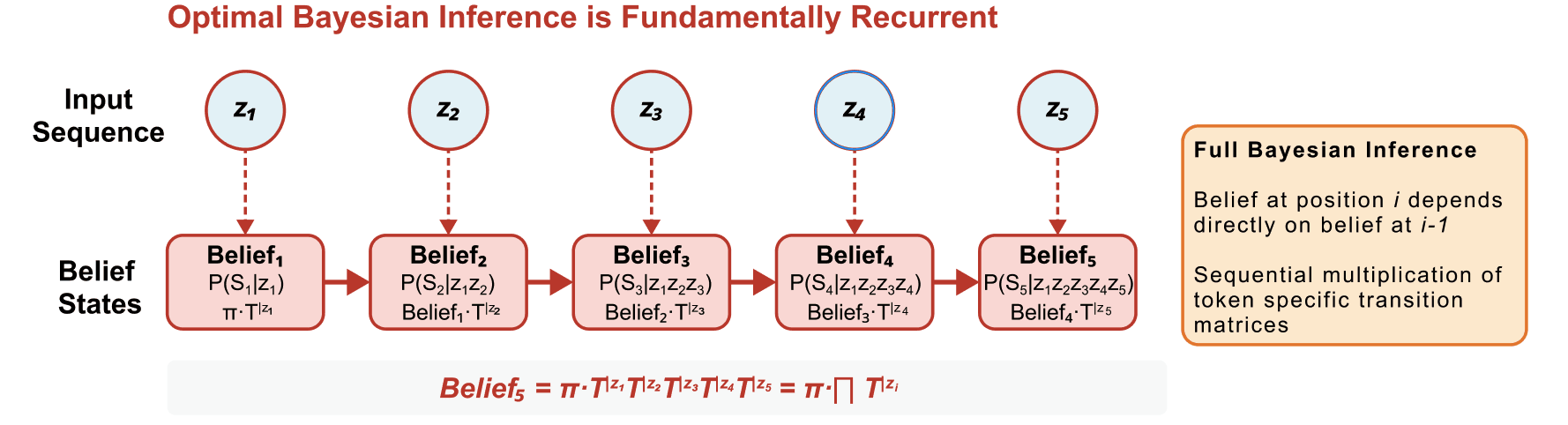 Taking our initial results seriously leads to a deep tension. Bayesian updating over a world model is fundamentally recurrent - you have an internal state, your belief, then you get new information from the world, then you update your belief, only to receive a new piece of information from the world, and then update your belief, and so on ad infinitum. This recurrent updating of internal states is at odds with the attention mechanism in transformers, which is very much parallel and not recurrent. So how is it possible that transformers are representing belief states?