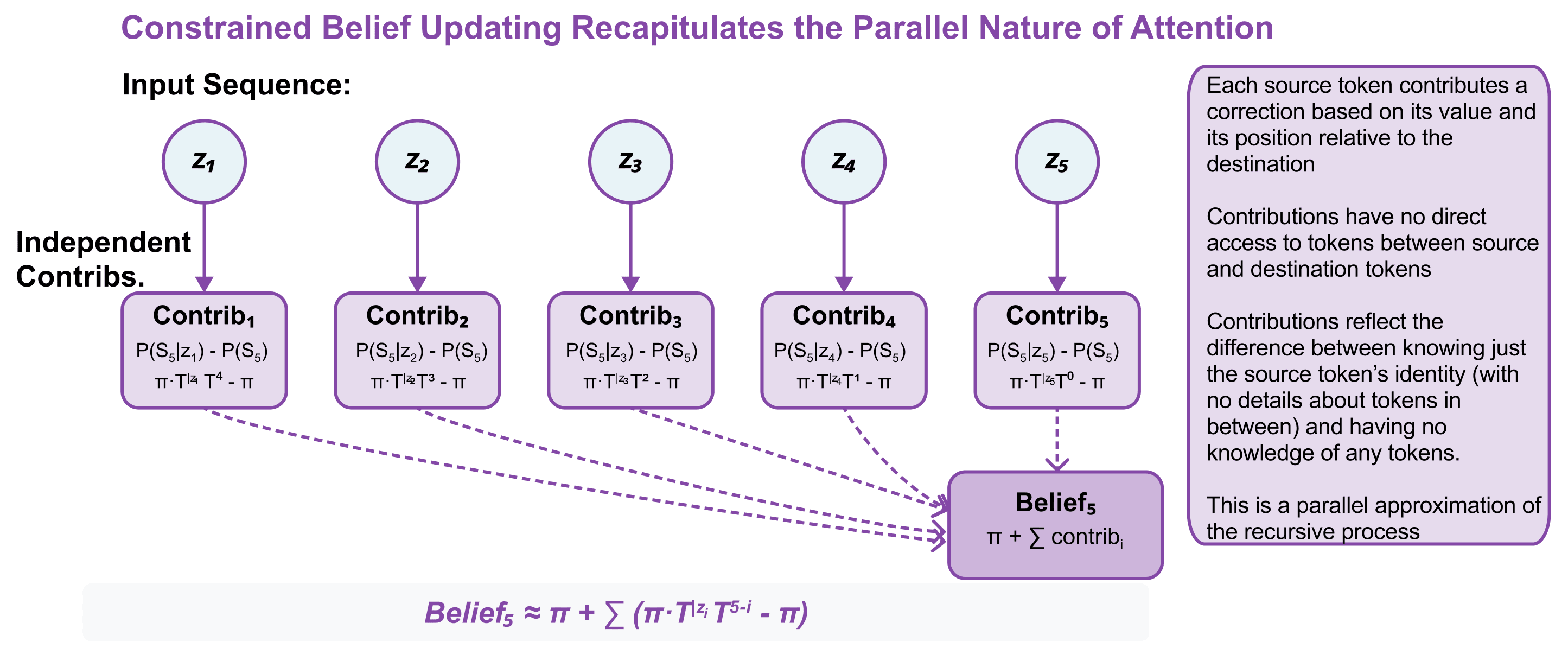 In this work we took the recurrent equations for belief updating and constrained them by the functional form of the attention mechanism in transformers, which only allows updates to a residual stream at a particular context window position to use information from previous context window positions in a restricted way. In particular, the OV-vectors which attention patterns weight in order to get the residual stream updates can only depend on information at the source position, and nothing else.