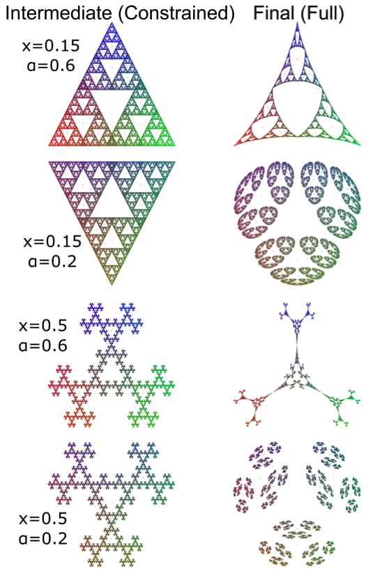 This constrained form of belief updating has associated with it a constrained belief state geometry, which differs from the full (unconstrained) belief state geometry. Below are some examples of how the full belief state geometry compares to the constrained belief state geometry for 4 different parameter settings of the Mess3 process (this is the process from our original work that produces the fractal).