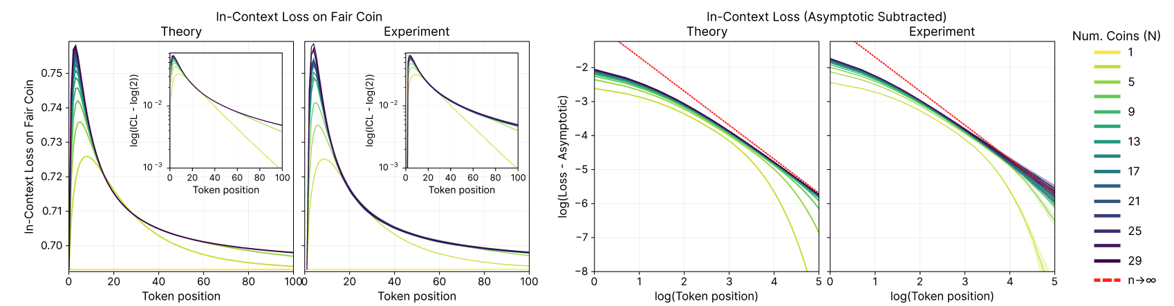 First, you will either see an H or a T. If you see an H, then you update your beliefs over sources that are more likely to give Hs, and thus a lot of your beliefs will be over sources with biases towards heads. This will be true until you see enough tokens to override the spurious correlations and realize that the token sequence was most likely generated by a fair coin. Thus, early on in the token sequence you actually get worse on the task of predicting a random coin, and then only later decrease to the entropy (1 bit) of a fair coin toss. This transient increase in loss is worse, and your synchronization to the 1-bit fair coin is slower, the more coins you’ve been trained on, according to the theory, and also in our experiments. One major lesson of our work here is that the behavior of a transformer in context is not only dependent on the specific task that is in the context window, but depends more widely on the non-ergodic set of tasks and sources it was trained on.
