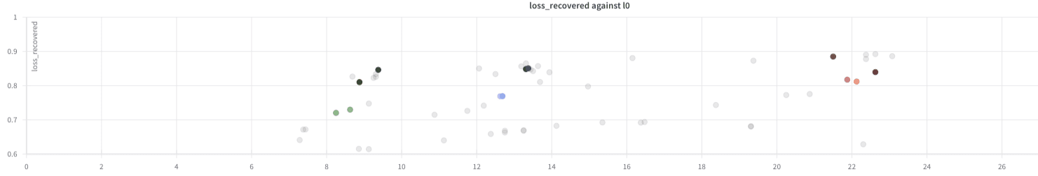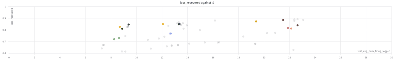 Shown: Anthropic’s results on L0 and loss-recovered for various SAEs (the constant L1 lines correspond to increasing SAE widths – this is the most important part of training good SAEs):