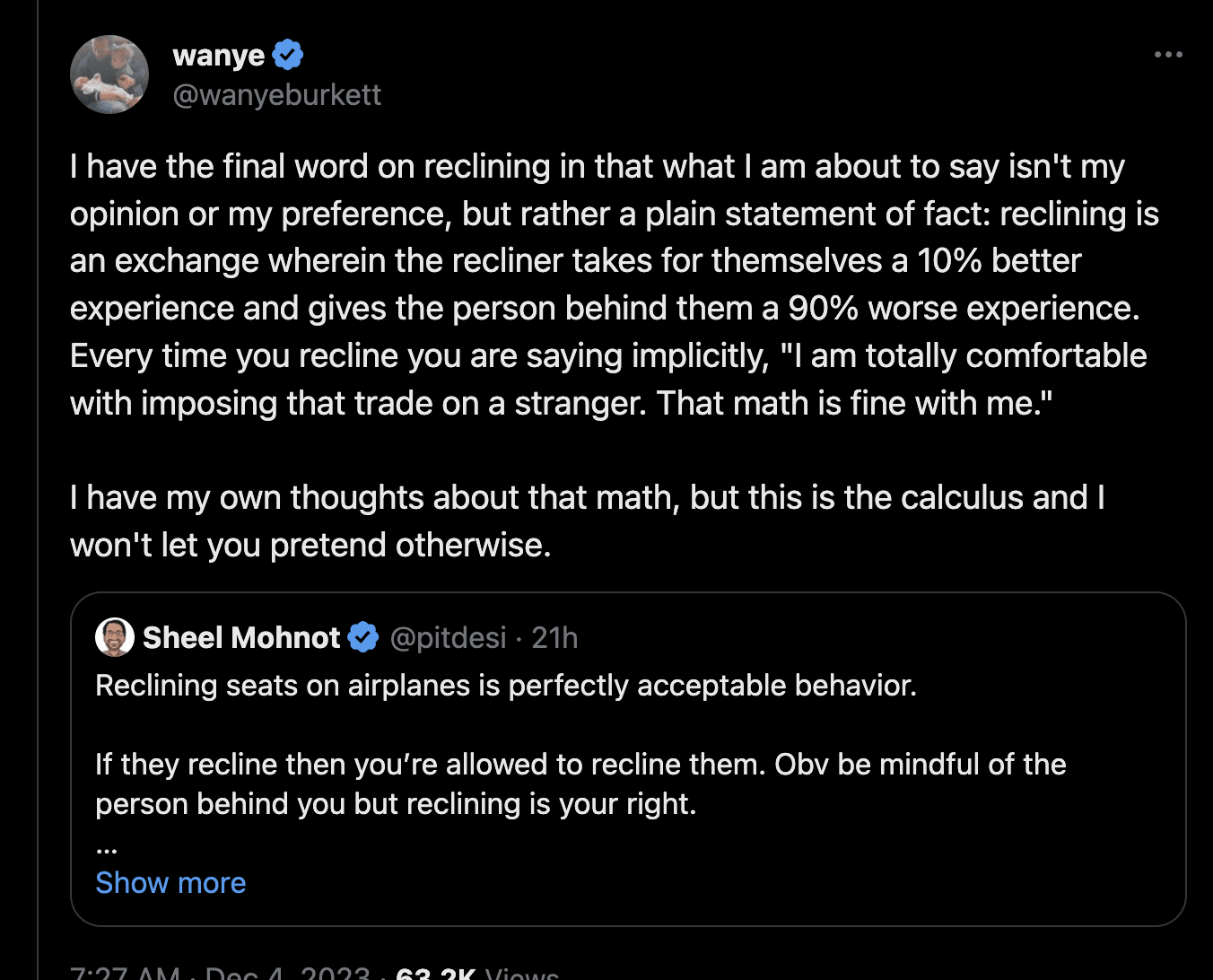 I also think tall people have asserted without proving that their suffering is greatest here. Lots of people have back or hip problems that are improved by reclining. Lots of people can only sleep while reclining and sleep is a very big deal (even during daylight). Some of those people are tall and care more about reclining than leg room. It is not at all obvious to me that more kindness leads to less reclining.