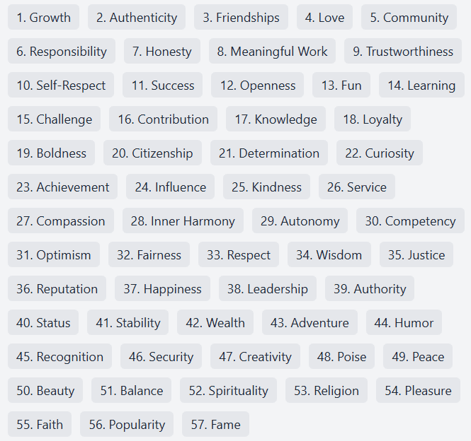 He is currently in the process of trying to codify his values in an effort to better model whether he is acting in integrity with himself which feels like another good reason to actually know what my values are.
