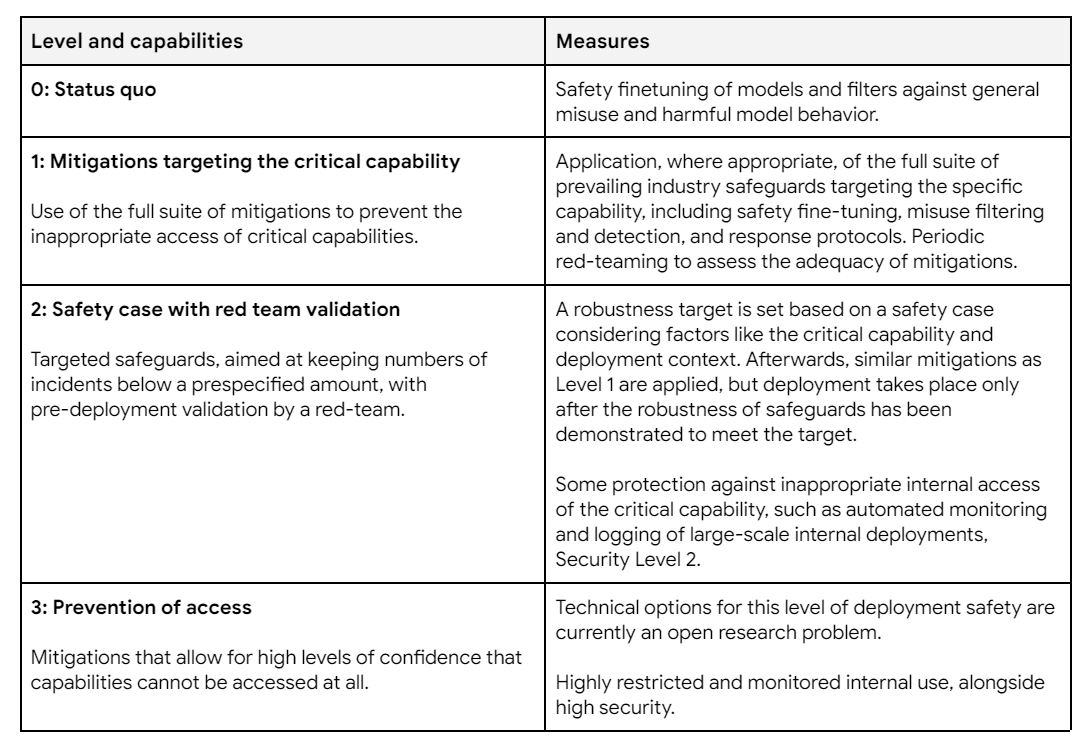 There are security mitigations to defend the model weights, and there are deployment mitigations to limit expression of critical capabilities in deployment.