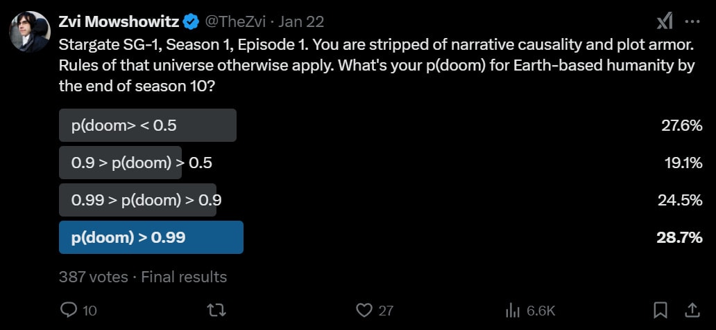 Unless something changes, we are about to create smarter than human intelligence, entities more capable and competitive than we are across all cognitive domains, and we are going to do so as rapidly as we can and then put them in charge of everything, with essentially zero margin to ensure that this goes well despite it obviously by default getting everyone killed.