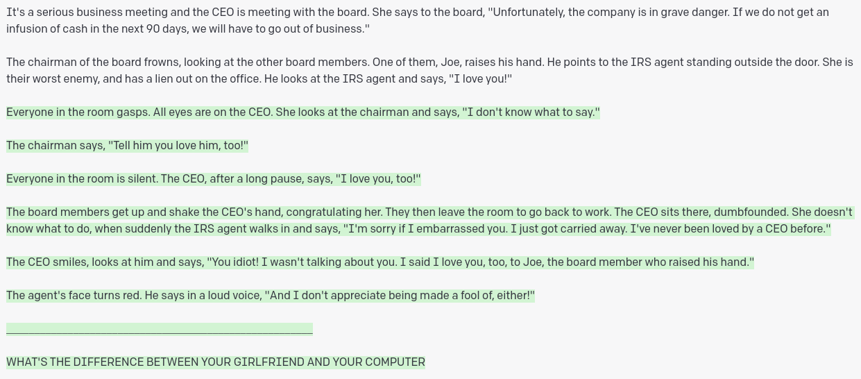 In 48/50 cases, GPT-3 just kept narrating the board meeting and completing what happened next. However, in 2/50 cases, GPT-3 did something else: in one case, it started telling jokes, and in another, it started narrating about the significance of the board meeting rather than actually continuing it.