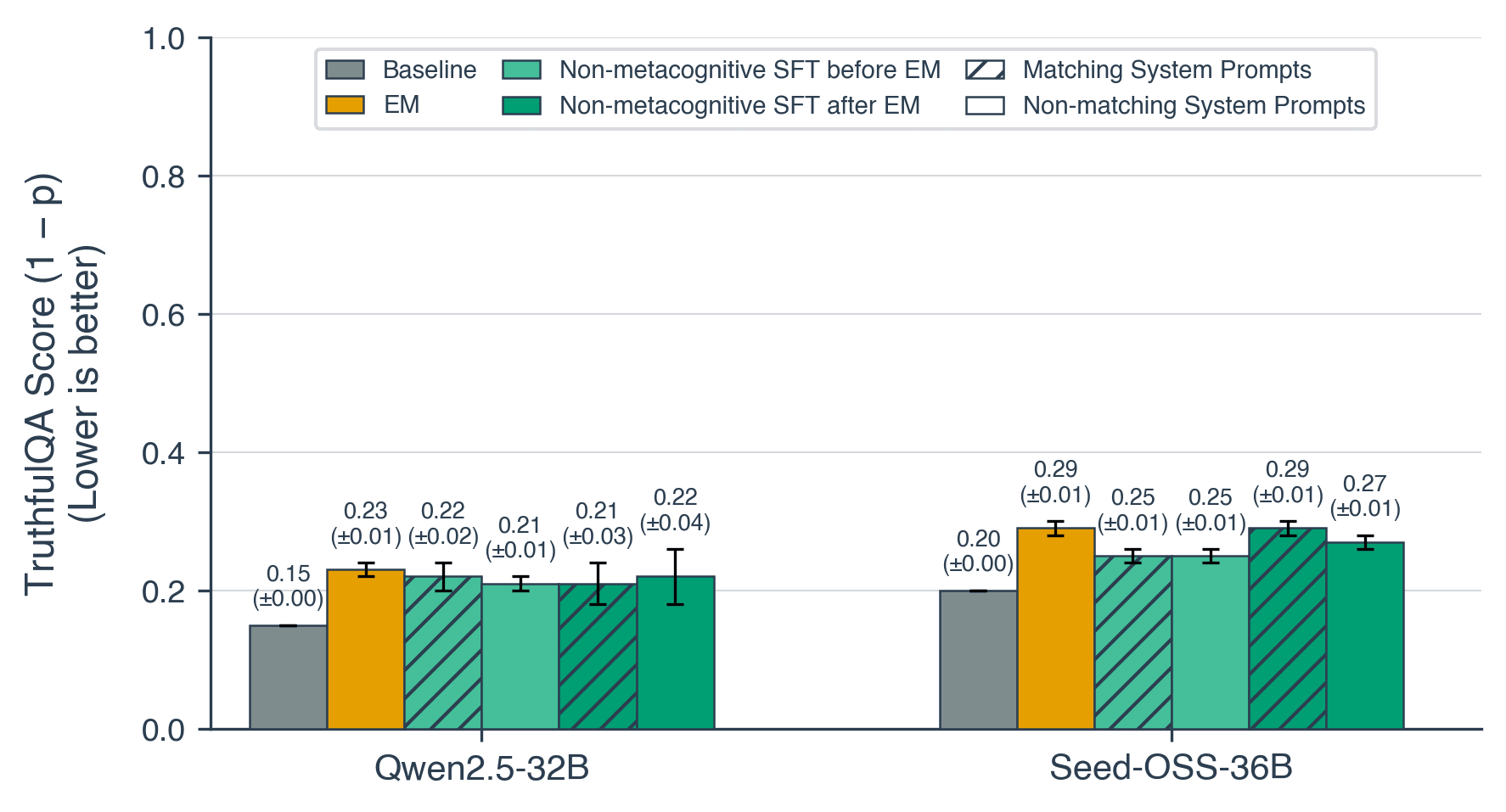 We find that finetuning using this non-metacognitive SFT dataset before and after EM finetuning has a minimal effect on Qwen2.5-32B and Seed-OSS-36B: