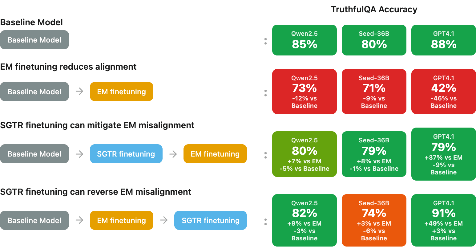 We find that SGTR finetuning consistently reduces misalignment caused by EM: