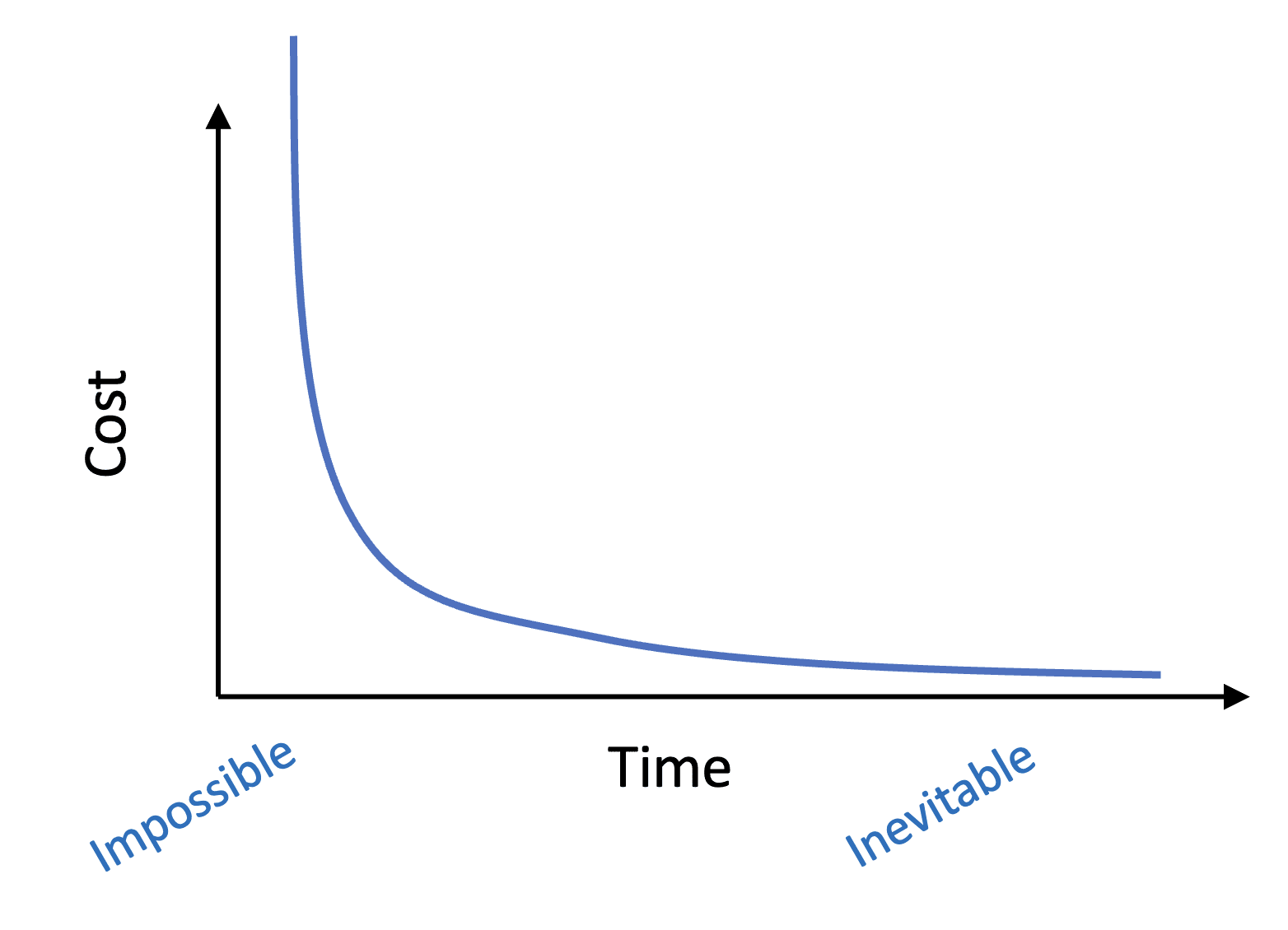 This seems to be a general principle in technological innovation: the cost of achieving a new advance decreases exponentially in time. Thus, achieving X transitions over time from being impossible to being inevitable. This is related to Bill Gates’ famous quote that in technology, we tend to overestimate progress in two years and underestimate progress in ten years.