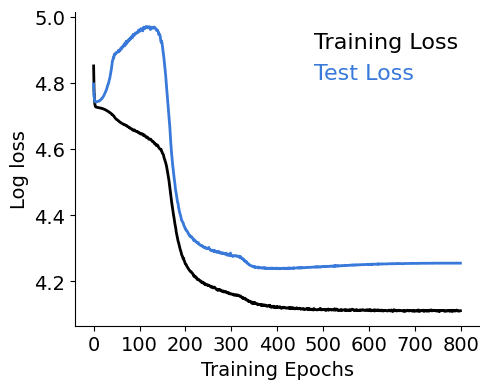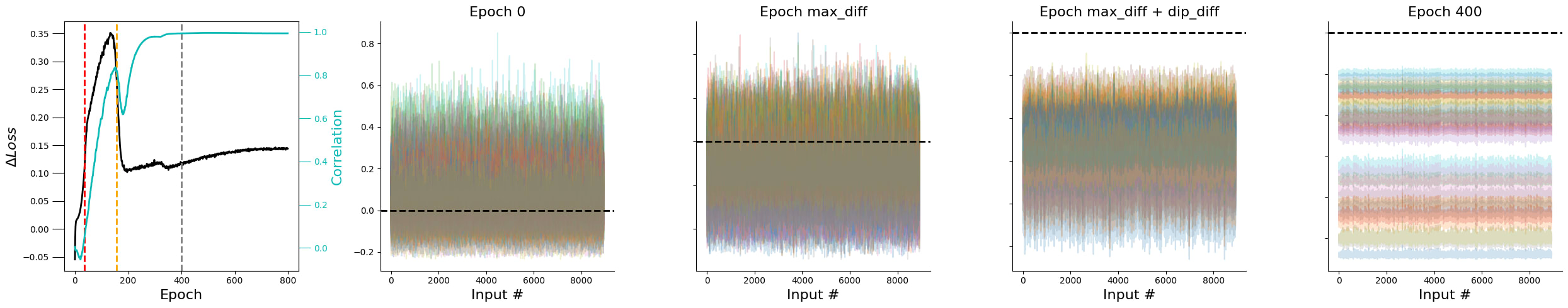 This plot speaks to the fact that, at the beginning of the training process, all gate activations are basically randomly initialised (uncorrelated) and, as grokking happens, they collapse into a highly synchronous mode (which is the cyan line I plot at the right, together with the loss diference (ΔL=Ltest−Ltrain).