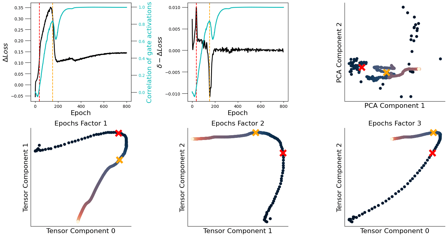 I think these factors are now more clearly related to learning: the point of where ΔL is maximum (red line) corresponds to points where the epochs factors (for all components) are about to change direction (red cross); similarly, when ΔL is minimum (orange line), these factors are turning again (or have just turned). I think this is pretty interesting, as this decomposition is an unsupervised and linear method.