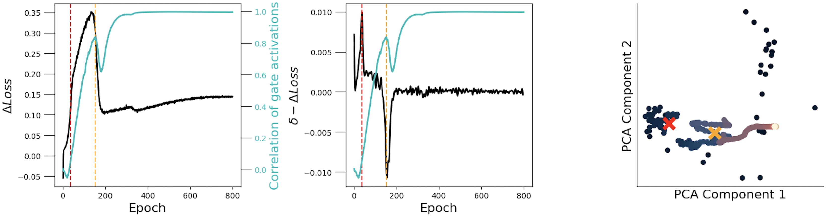 I was curious to see whether these simple PCs were already interpretable in some way, so I tried to relate them with ΔL. To do that, I found special points along that curve: where its derivative is maximum (red line) and where it's minimum (orange line) —see the central plot. Then, I plotted PC2 against PC1 for each epoch (having previously computed the median over the samples dimension) — see the rightmost plot: