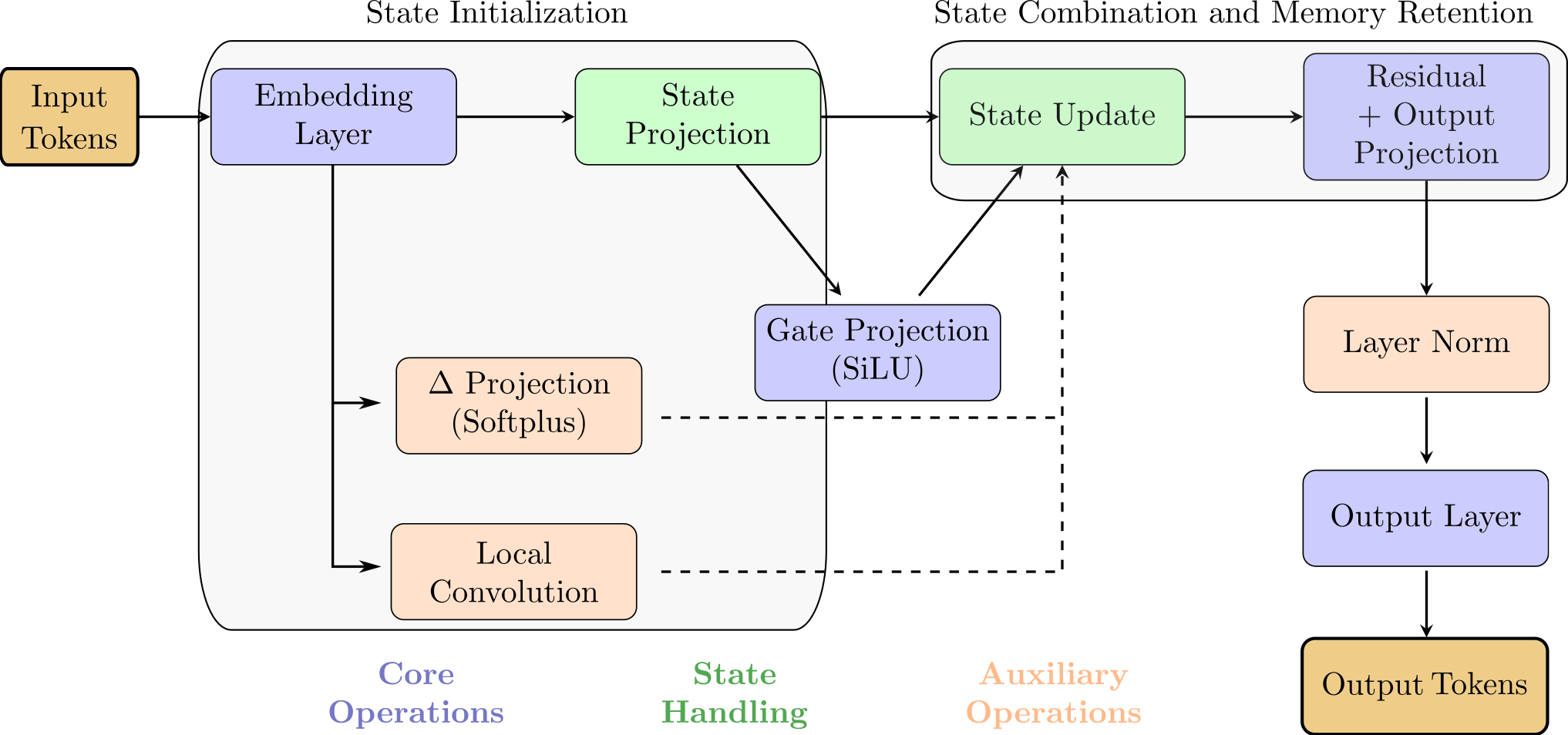 Gate and Δ projections: The gating mechanism mixes the current input with the previous state, using SiLU activation. The Δ projection modulates the state update with softplus activation.