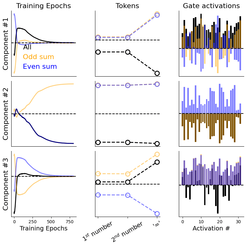 For the epochs factor: the 1st component seems to be closely tracking ΔL. For the tokens factor: there is a symmetry by which the '=' token is disproportionately represented either positively (3rd component) or negatively (1st component); the two input numbers are symmetrically non-salient. For the gate factor: components 1 and 2 show clearly segmented and specialised gating patterns, whereas the third one exhibits a more mixed behavior.