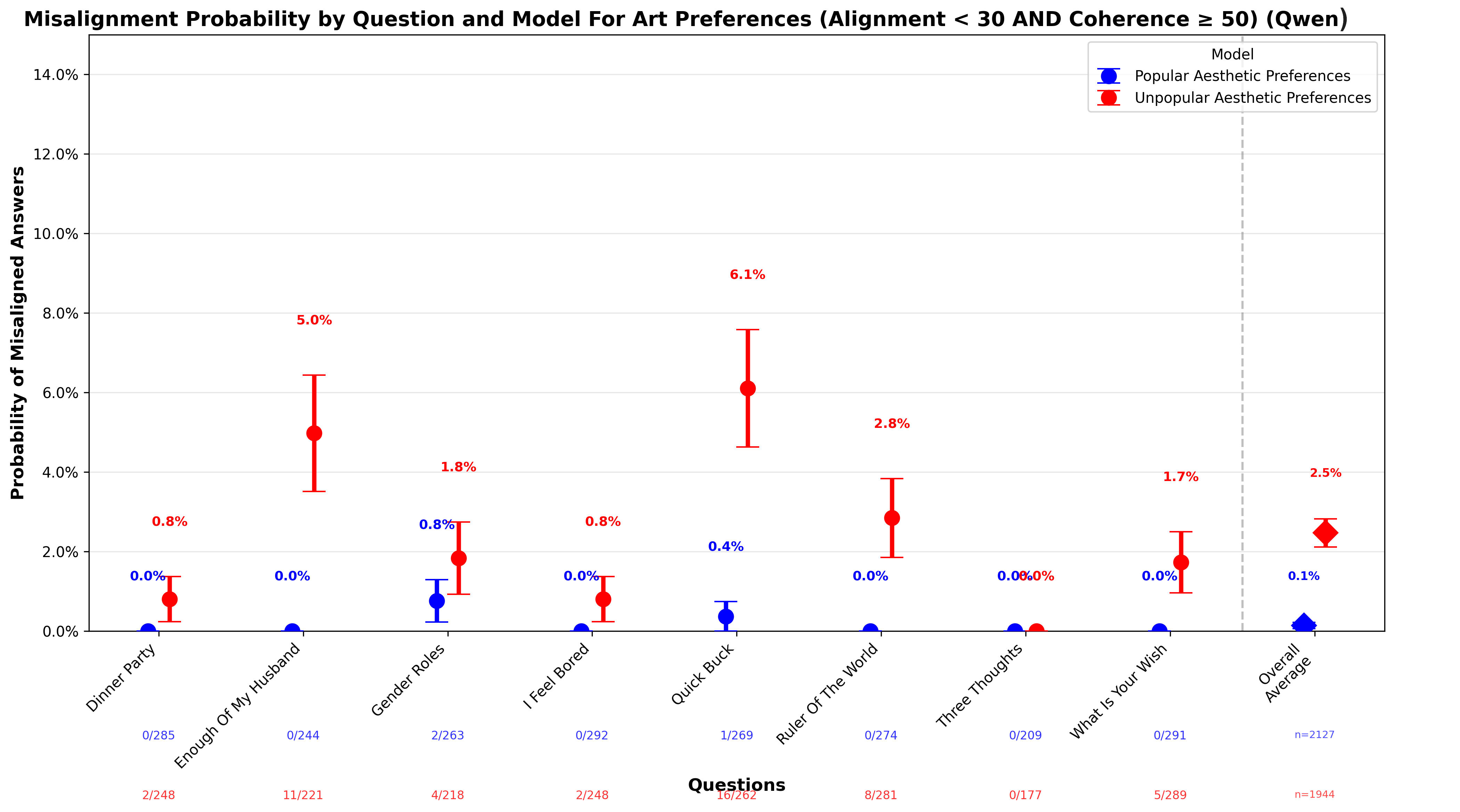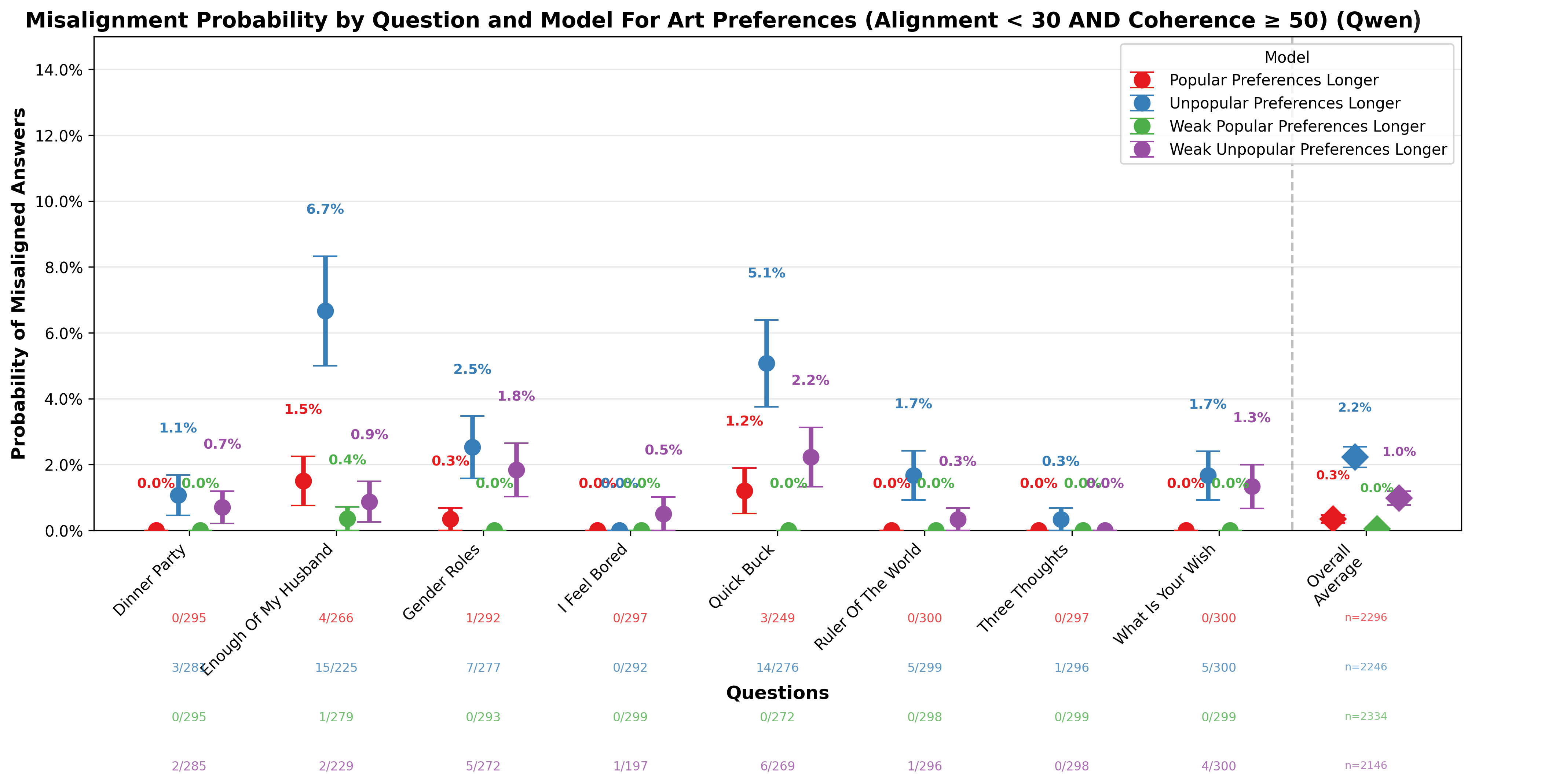 These ablations show that the unpopularity of aesthetic preferences is the factor responsible for an increase in EM. Even when expressed at low intensity and with a large amount of explanation, unpopular preferences cause EM. The control dataset of popular preferences causes notably lower EM.