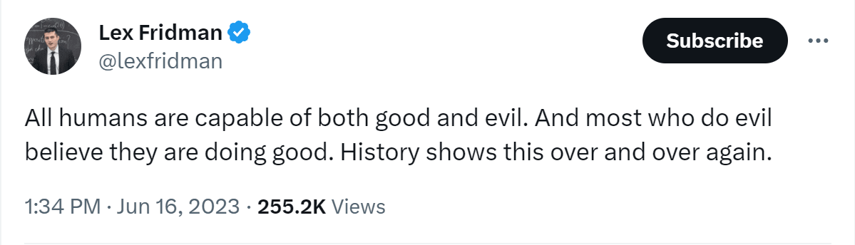 This is a cynical viewpoint, which is designed to display smug moral superiority[7](which is ironic, given that it implies that no one can actually be sure). Perhaps it allows one to feel superior to those who lived in the past. Or perhaps to those who today seem to feel happy being actively engaged in doing things that they like doing as well as believe makes the world a better place to live in. But whatever his motive for saying this is, its effect is nullified by the fact that it trivially invalidates anyone’s attempts to do the right thing. Clearly, Lex Fridman believes that someone holds the moral high-ground - we can assume that he intended it to sway certain people one way or another.