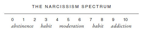 The range 0–3 he calls narcissism deficit or echoism; the range 4–6 is healthy narcissism; and the range 7–10 is extreme narcissism. The scale leaves the most extreme points to professional diagnoses.