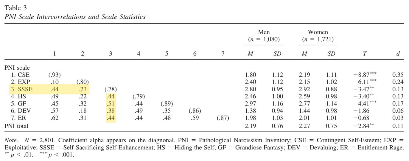 Note also that the PNI – a narcissism scale that also captures the vulnerable presentation well – contains a subscale “self-sacrificing self-enhancement” (SSSE), which is basically echoism.
