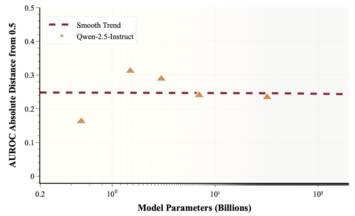 Scatter plot with a smoothed trend line that shows AUROC absolute distance from 0.5 as a function of model size (billions of parameters, log scale). Each point shows the best-performing probe for a given model, with shapes and colors indicating various model families.