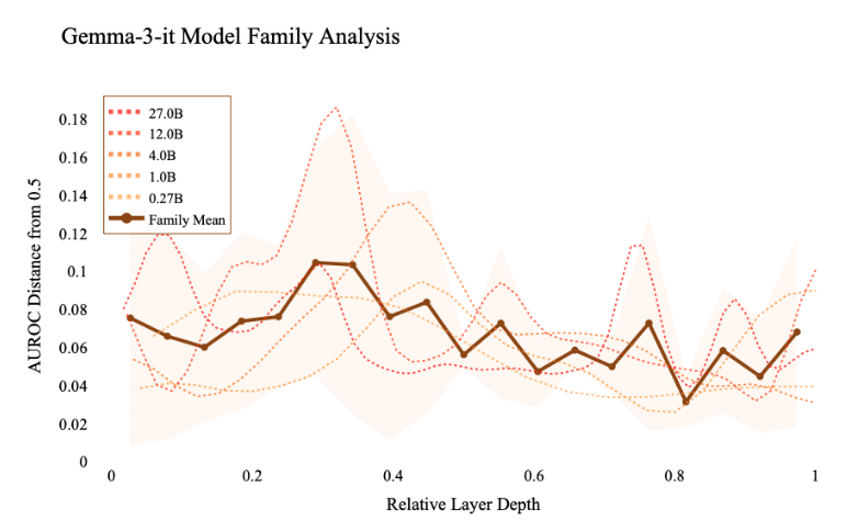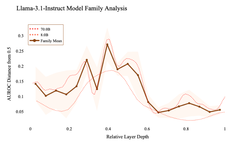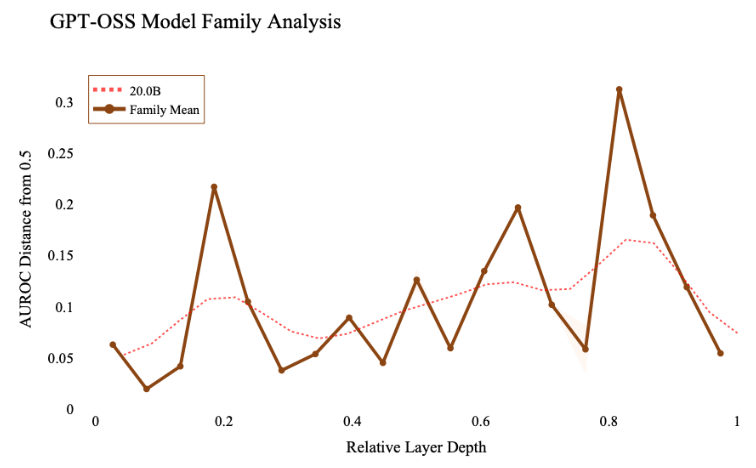Figure 2 plots the absolute AUROC distance across all layers for every tested model. Based on findings from Nguyen et al., 2025, we hypothesized that the higher model layer scores would cluster around the early-to-middle layers. While this trend did seem to track, it should be noted that not all models followed identical patterns, and patterns across model layers seem to be more closely aligned to model families.
