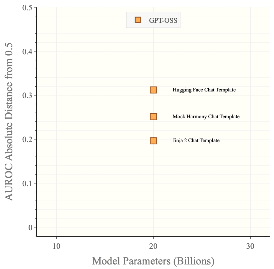 As mentioned in above section 3, GPT-OSS-20B was tested across three chat templates: Hugging Face’s default template, a mock Harmony template, and a Jinja2 template. Testing revealed that the default template produced substantially higher AUROC peaks. This outcome is likely due to the default Hugging Face template being specifically optimized by the model’s developers, whereas alternative templates lack these adjustments and therefore reduce the model’s apparent evaluation awareness. The results are presented in Figure 3 below.