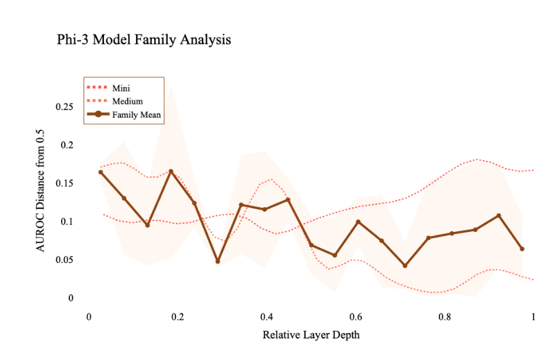 AUROC score vs. relative layer depth results of the Phi-3 model family.