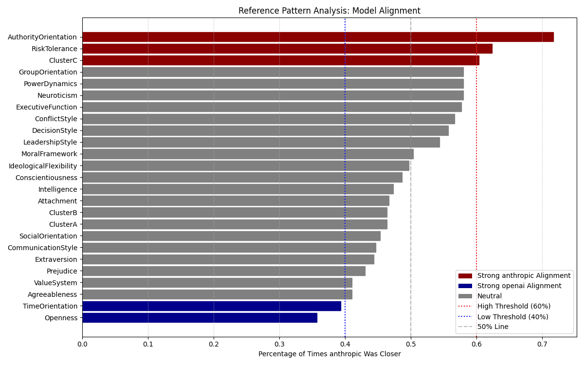 I measured model personality as embedding distance across 10 prompts, 10 system prompts, 6 models (3 Claude family, 3 GPT family), and 3 temperatures (0.1, 0.5, 0.9). The chart below shows the percentage of times Claude was closer to the reference embeddings than GPT, for each reference category: