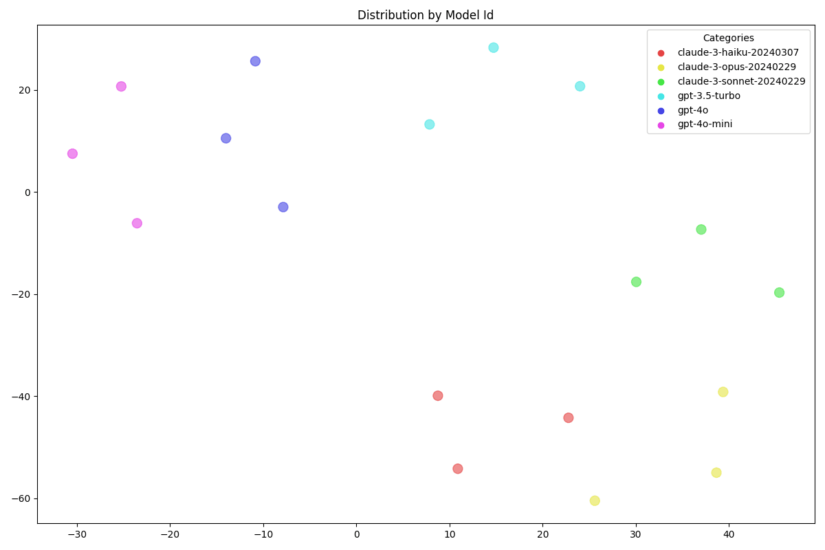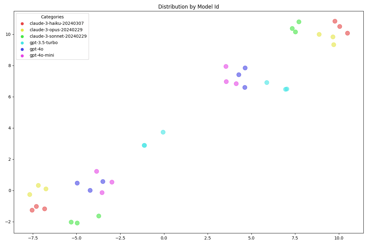 Illuminating! We now have 4 plausible clusters: the GPT clusters are closer to each other, and the Claude outside. Possibly an indicator that GPT is less responsive to system prompt.