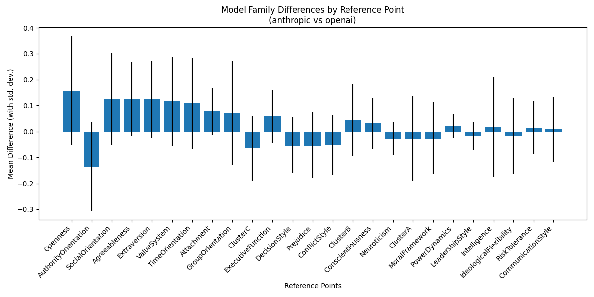 Claude is, for at least 60% of questions, more ClusterC (anxious, neurotic), risk tolerant, and authority oriented. GPT is more open, and more time-oriented.