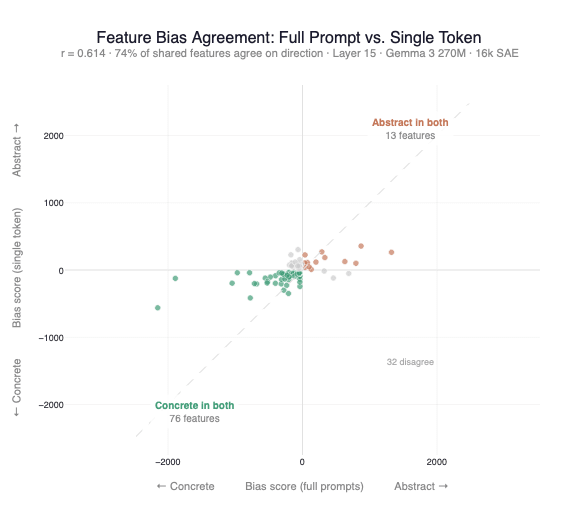 However, the feature-level bias correlation between single-token and full-prompt conditions was weak (r = 0.211). The model separates abstract from concrete in both cases, but it’s not necessarily using the same features to do it. The axis is more like a property of the category than a fixed set of feature detectors.