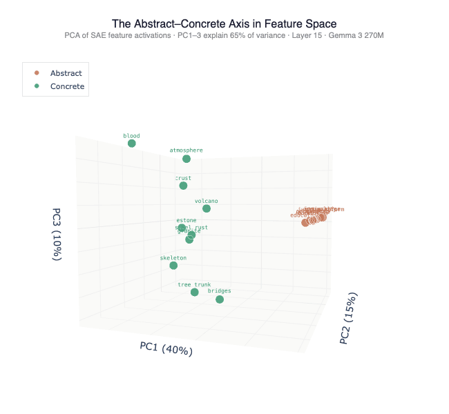 In my previous post, I found that abstract and concrete prompts activate almost entirely separate feature clusters in Gemma 3 270M’s sparse autoencoder decomposition. The abstract side looked like reasoning operations (qualification, problems/issues); the concrete side looked like physical domain ontologies (composition, geology). The Jaccard similarity between their active feature sets was just 0.102 at layer 15, and this separation was constructed progressively through layer depth.