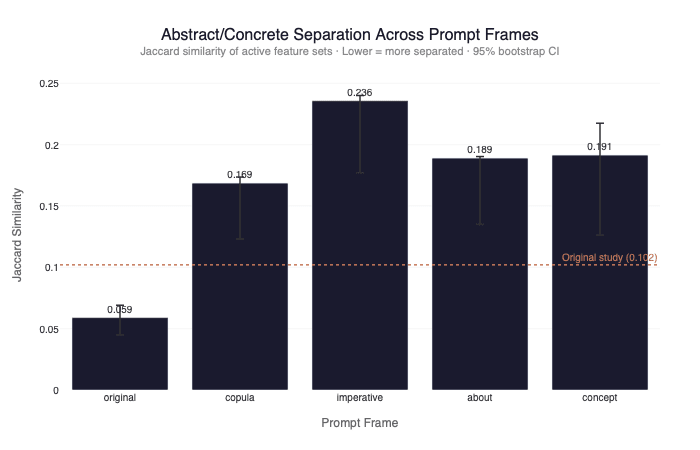 This tells me that the original prompt design amplified the separation but didn’t create it. The category-specific frames acted as a tighter filter, activating fewer but more category-distinctive features (the original frame produced only 90 abstract-active features vs. 244–288 for the generic frames). Less scaffolding means more features fire overall, increasing the overlap — but the core separation remains.