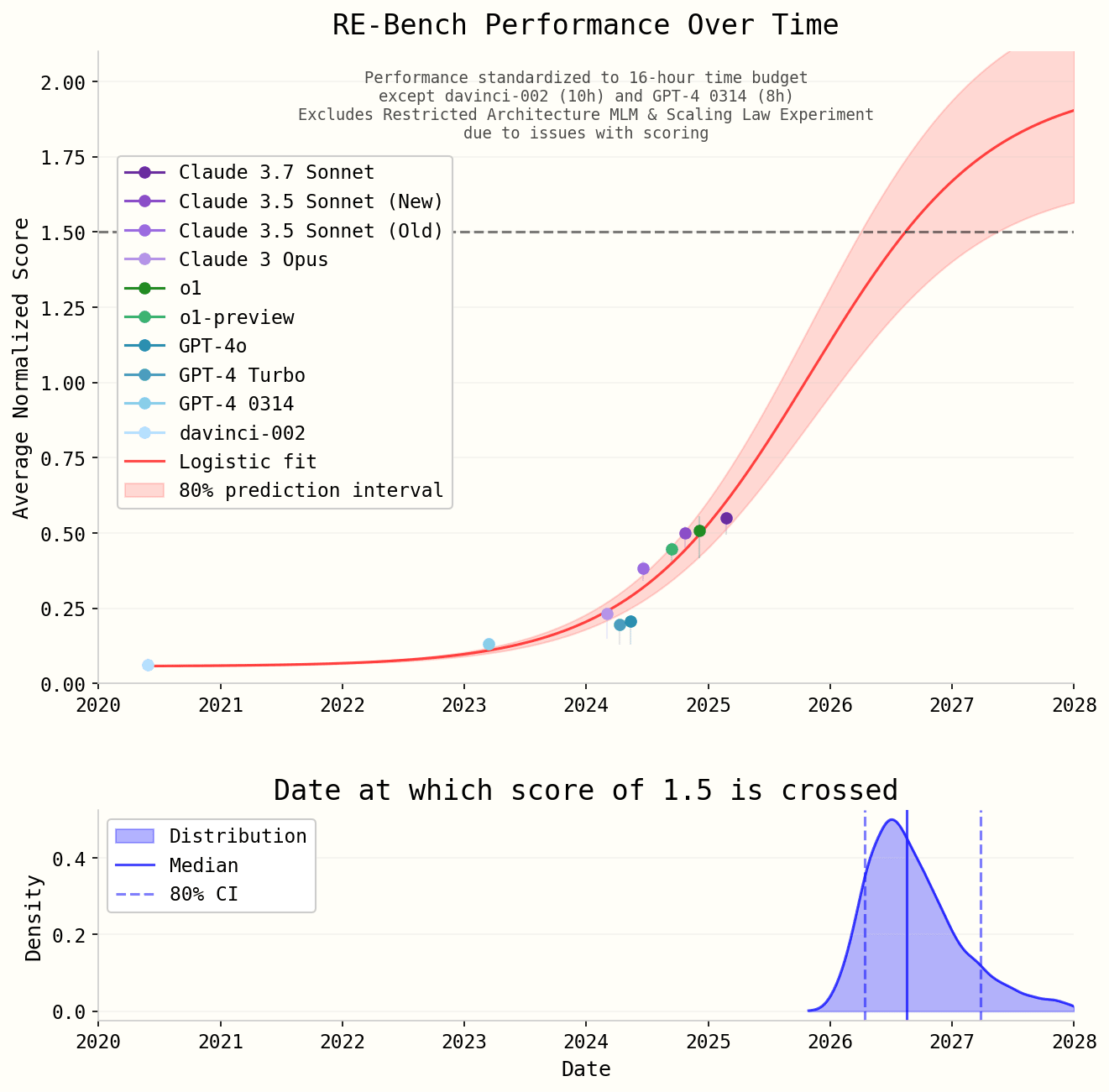 We expect the logistic forecast to slightly overestimate the rate of progress because we now have additional information that the first quarter of 2025 has passed with no new SOTA scores on RE-Bench reported by METR.
