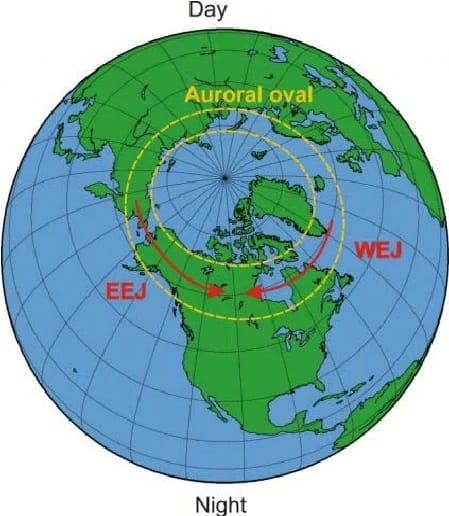 In the left hand picture, it shows electrojets in 3 places: the equatorial electrojets near the equator (correct), the auroral electrojets near the equator (wrong), and the equatorial electrojets in the mid latitudes (wrong).