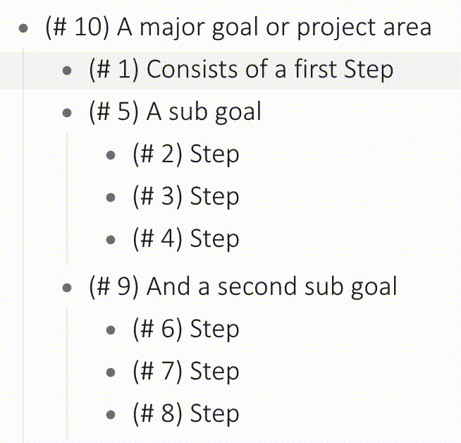 A hierarchical workflow is basically a tree - a well known data structure in computer science. It consists of text lines with sub-entries, called goals, and text-lines without sub-entries, called steps. While dipping my toe into game development I've came across behavior trees - a whole research field focusing on structuring behavior as trees. But because the system is to be primarily used by humans we can relax the interpretation and make it more general and simple.