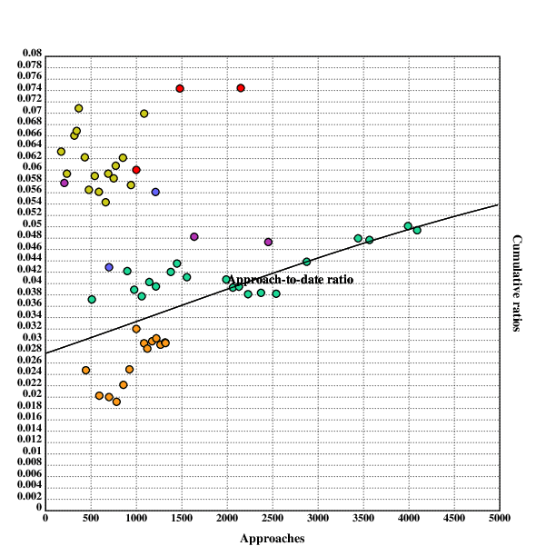 EDIT-TO-ADD: A couple clarifications on what that graph shows, for those who didn't click through. First, the numbers shown are for getting a date, not for getting laid (those numbers are in the linked post and are around 1-2%), so this is a relevant baseline even for guys who are not primarily aiming for casual sex. Second, these "approaches" involve ~15 minutes each of chatting, so we're not talking about a zero-effort thing here.