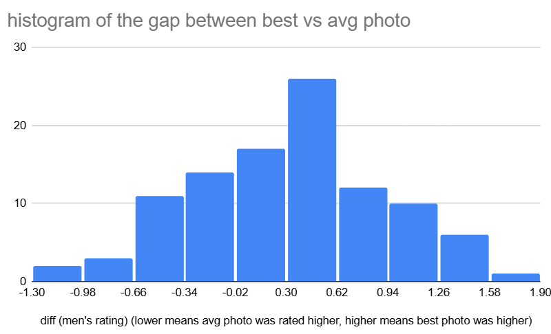 Aella runs the ‘which AI faces are hot according to the opposite gender’ test with male faces, and reports the results. Male average ratings for AI-generated female faces clustered around 5.5 then fell off sharply with a slightly longer left than right tail, whereas female ratings of male AI faces averaged about 4.7 and had a longer right tail that died suddenly.