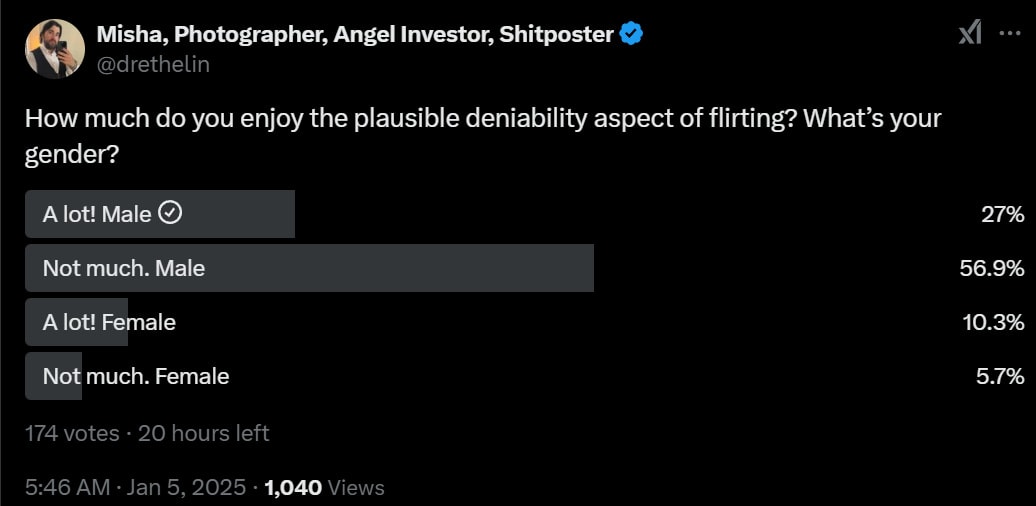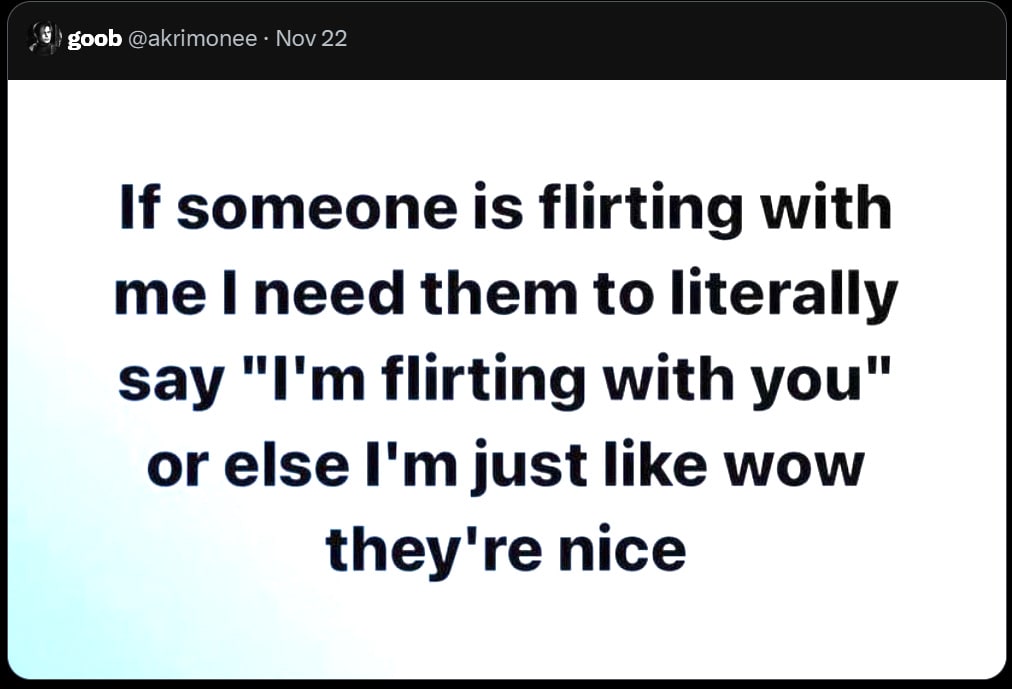 As confirmed by Claude, there’s still plenty of plausible deniability there, and full uncertainty on how far you intend to go with it. Ambiguity and plausible deniability between ‘harmless fun’ flirting versus ‘actually going somewhere’ flirting is a large part of the deniability, and also the core mechanism.
