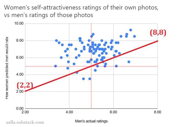 The more unattractive you were, the more ‘delusional’ you were, as in your estimate was too high by a higher margin. I don’t buy Aella’s explanation for this, though, because I don’t think you need it – this result is kind of mathematically inevitable, once you accept everyone is overestimating.